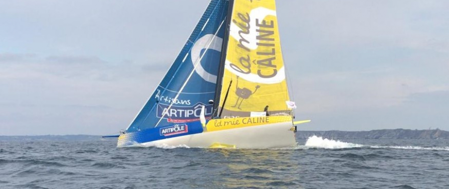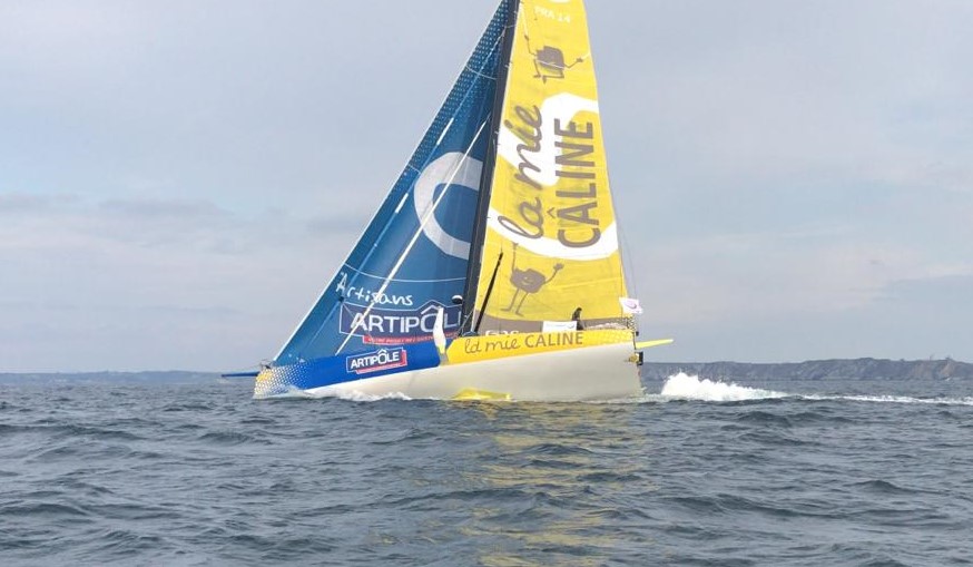 Arnaud Boissières (La Mie Câline – Artipôle) : « Ce genre de parcours, c’est super intéressant. On a été plusieurs bateaux à se batailler et on a navigué pas mal à vue. C’est le genre de situation idéale pour apprendre à performer avec la machine donc c’est chouette. Je suis quand même content d’avoir fini juste devant Stéphane (Le Diraison). C’est bien parce que c’était incertain ce matin. On était cinq dans un mouchoir et on n’avait pas vraiment idée de l’ordre dans lequel ça allait finir. J’ai un peu merdé avant le Fastnet. Je suis parti tout seul sur un bord vers l’ouest et en fait ça n’a pas été un bon coup du tout. Au sud de l’Irlande, je me suis retrouvé un peu derrière et du coup il a fallu trouver les moyens de revenir au score ensuite. Comme le bateau a beaucoup de potentiel, ça m’a pas mal aidé. Ce qui est bien c’est qu’on a utilisé toute la garde-robe du bateau et surtout, on s’est fait deux bords de runs intéressants pour voir à quelle vitesse pouvait aller le bateau. La conclusion c’est qu’il va bien mais en revanche, il mouille un peu. Il va falloir améliorer un peu le confort mais globalement, c’était vraiment super. C’est toujours bien de faire du solo. Ça permet vraiment de se mettre dans le bain du Vendée Globe. A mon sens, on n’en fait jamais assez en course. »