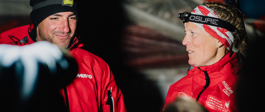 Sam Davies et Damien Seguin (Initiatives Cœur), 5e : « C’était trop bien ! C’était trop cool de se bagarrer avec les gars de Maître CoQ V. On leur a même envoyé un message à la fin pour leur dire qu’on avait vraiment trouvé génial notre speed-test de presque cinq jours ! On était en vue AIS tout le temps. Pour bien apprendre le bateau, c’était très bien. Cela nous a permis de faire des comparaisons. Le parcours a été assez complet. On a pu tester la machine dans du petit temps puis de la brise. On a utilisé toutes les voiles sauf le tourmentin. C’était le but. On est partis un peu fatigués tous les deux après la grande étape dans le Sud de The Ocean Race. Heureusement, en double, on a pu tourner et les bords étaient longs. Peut-être que le fait d’avoir déjà passé beaucoup de temps en mer entre Cape Town et Itajaí, nous a permis tout de suite de bien être dans le régime du large. On n’a pas gaspillé de temps à rester à deux tout le temps. On s’est ainsi bien reposés, même si ça n’a jamais été très reposant. Il y eu des bords vraiment sympas pour voir ce que le bateau a dans le ventre mais aussi pour tester des configurations différentes. On s’est super entendus. C’était la première course de la saison pour Initiatives Cœur. Il a bien progressé cet hiver avec le chantier qui a été réalisé. On a pu avoir pleinement confiance. C’était trop bien d’être au contact de Maître CoQ V mais aussi du groupe de tête. On a pu comparer les vitesses et essayer des choses. C’était parfait. »