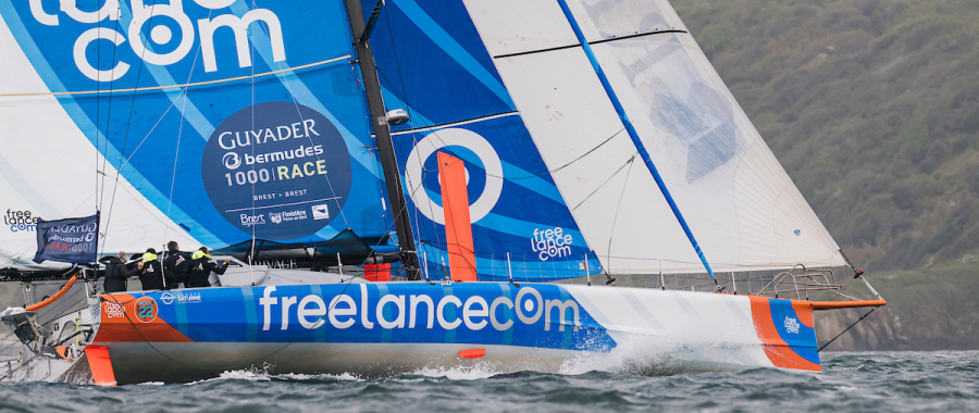 Ce matin, à 8h30, Guirec Soudée et Corentin Douguet ont été arrêtés net dans leur progression vers le Fastnet, prochaine marque de parcours sur la Guyader Bermudes 1000 Race. « A l'approche d'un grain, ils ont voulu enrouler mais le temps d’abattre, le bout-dehors s’est cassé », a expliqué l'équipe technique de Freelance.com . Les trois hommes à bord – Guirec Soudée, Corentin Douguet et leur mediaman, Adrien Cordier – n’ont pas été blessés dans l’avarie. Ils se sont déroutés pour rejoindre la terre. Il s’agit de la première avarie majeure pour Guirec Soudée depuis ses grands débuts en IMOCA il y a an.