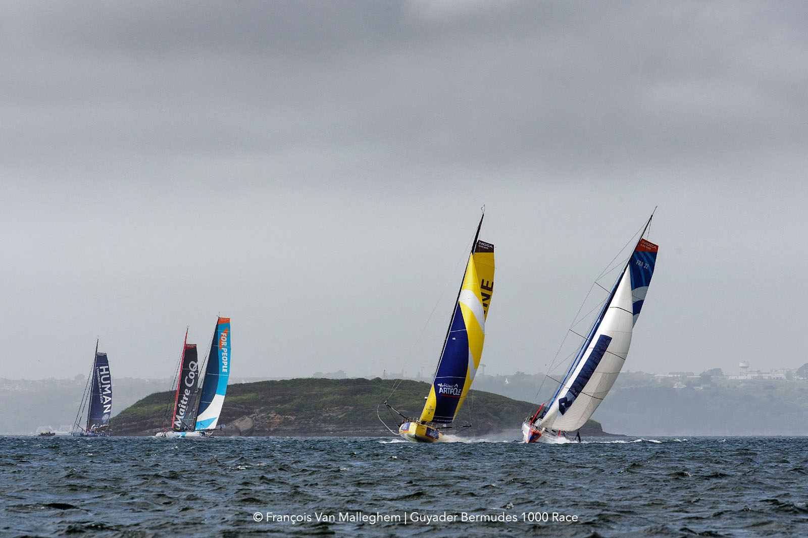 The sailors were grinning from ear to ear dockside in Brest this Friday afternoon and not just because of the occasional clear spells. Indeed, throughout the afternoon, the 13 boats competing in the Guyader Bermudes 1000 Race Brest-Brest headed out into the Roads area to compete in some Défi Pom’Potes speed runs. Not as demanding or tough an exercise as offshore racing, it gave onlookers a real insight into a sailor’s passion for the sport as they return to the heat of competition. With a relatively shifty 20 to 22 knots of breeze, squalls and flat seas, conditions were perfect to put on a ‘big show’, according to Thomas Ruyant.